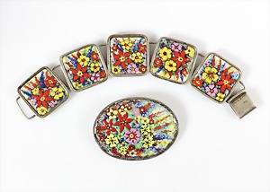Lot: Brosche 1960er Jahre, Silber 900/000, sig.: K (zwischen gravierten Elementen), Emaille, 57 x 44 mm; Armband, Silber 835/000, Emaille, L = 18,5 cm, farbenfroher Blütentraum !