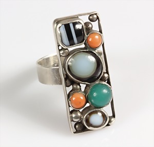 Ring, Silber (geprüft), Augen- und Streifenachat, 2 Korallen, 1 grüner Stein, RW ca. 59,5