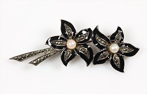 Brosche "BLÜTEN" 1.Hälfte 20.Jhd., Silber (geprüft), Markasiten, 2 Akojaperlen, Emaille, L = 57,0 mm