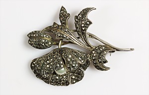 Brosche "BLÜTE" 1930er Jahre, Silber 925/000, Markasiten, Akoja-Perle, plastisch schön ausgearbeitet, 56,0 x 45,5 mm