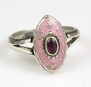 Ring wohl Umfeld "THEODOR FAHNER" Pforzheim, Silber 800/000, signiert: IEI ?, Mattemaille, amethystfarbener Stein (Tragespuren), Ringschiene umlaufend fein punziert, RW ca. 57