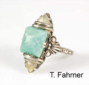 Ring "THEODOR FAHRNER" Pforzheim, Silber 925/000, sig.: T DEA, Amazonit (Calcedon), Ringschiene umlaufend mit Ornamenten verziert, RW ca. 56,5