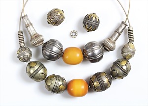Lot: 2 Halsreifen Vorderasien (Afghanistan/Indien) alte Silberelemente teilvergoldet, bernsteinfarbene Oliven, (1 Reif neuzeitlich vergoldet, 1 Reif, Silber), 2 Elemente lose, total 105,8 g