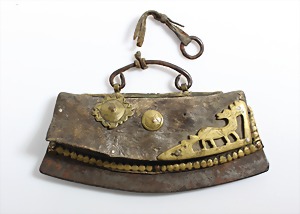 Feuertasche, Tibet, 19. Jh., kleines Ledertäschchen mit Eisenbeschlag und angenietetem Tragebügel, daran Lederband, umgeklappte Front-Lasche mit aufgenieteten silber-und goldfarben Zierappliken, stilisiertes Tiermotiv, beidseitig goldfarbene, noppiger Ziehrrand, ca. 10,5 x 19,0 cm Lederriemen gerissen