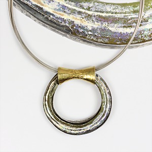 Halsreif "UNIKAT", Silber 925/000, L = 53,0 cm; Anhänger: "RÖMISCHER antiker ARMREIF" ca. 200 v. Chr. - 600 n. Chr., der Glasreif hat ein schönes Farbenspiel (entsteht durch Oxidation/Verwitterung) und ist in einer handgeschmiedeten Silberschale eingebettet, Aufhängung mit Feingold belötet, D = 76,0 mm