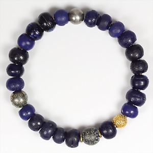 Glaskette "Goldschmiede-Unikat", blaues antikes Glas, Holland wohl Amsterdam 16. -17.Jhd., D = 20 - 25 mm, Silber u. aus Ösen gefertigte 750/000 Goldkugel, zentrale Glasperle sog. Machapahit-Perlen (Ost-Java) um 900 n. Chr., L = 47,0 cm