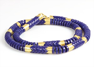 Glaskette "Goldschmiede-Unikat", blaues Glas Böhmen Mitte 20.Jhd. (gezackt u. in Scheibenform) mit 750/000 Goldelementen u. 925/000 geschwärzten Silberösen,L = 52,5 cm
