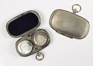Geldausgeber um 1900, Messing versilber, 2 Fächer für Münzen, der Deckel ist innen mit Samt ausgeschlagen und über einen Druckknopf zu Öffnen, ca. 61 x 36 mm (ohne Öse), schöne handschmeichelnde Form