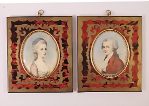 2 Bilder um 1910/20 Mozart und seine Braut, Rahmen mit Schildpatt ausgelegt, (Boule- Technik, zur Zeit Ludwig XIV angewandter Dekorationsstil), ca. 14,0 x 12,0 cm