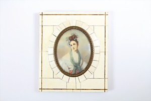Damenportrait (Gouache auf Elfenbein) um 1920, Rahmen komplett mit Elfenbeinintarsien ausgelegt, ca. 14,3 x 12,4 cm