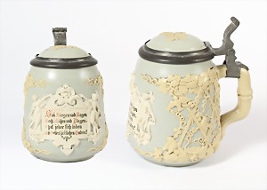 Relief-Bierkrug, hergestellt um 1890, sig: "VILLEROY & BOCH METTLACH", aufwändiges Dekor mit Weinreben u. Vögeln, Schild mit folgendem Spruch: Bei Singen und Sagen, Nach Mühen und Plagen, Thut jeder sich laben, An Gottes herrlichen Gaben; Zinn-Deckel mit Keramikeinlage, H = 137,5 mm, Formnummer: 1370, von Innen ist ein beim Brand entstandener Riss sichtbar ( Riss ist lasiert !)