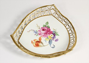 Schale mit Flechtrand, "MEISSEN" um 1880/1910, farbenfrohes Blumendekor, glasiert, part. polychrom bemahlt mit Glanzvergoldung, Wandung aus weitmaschigem Flechtwerk, Modellnr. W 104 u. 71, Maße: ca. 19,3 x 19,3 x 19,3 cm