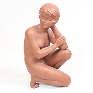 Frauenfigur, "KARLSRUHER MAJOLIKA, sig: fro, braune Keramik, junge Frau in kniender Haltung, H = 24,0 cm, anmutig !