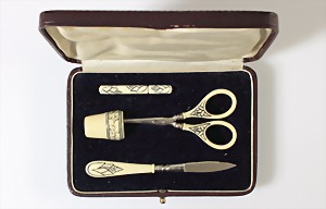 Nähset aus den 1920/30er Jahren, Fingerhut, Nadelbehälter, Schere - u. Messergriffe aus Elfenbein gearbeitet, fein akzentuierte Bemalung, Originalschatulle ca. 12,0 x 8,4 x 2,7 cm, (vorne im Fingerhut altersbedingte Fehlstelle/Abplatzer), sonst guter Zustand !