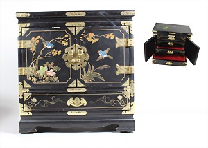 Schmuckkasten, China 2.Hälfte 20.Jhd., farbiges Dekor: Pflanzen - u. Vogelmotive, goldfarbene Beschläge, innen: 3 Schubladen, diese werden durch 2 Türen verschlossen, von außen ist 1 Schublade zu Öffnen, alle mit Samt ausgeschlagen, H 41,0 cm, B = 39,5 cm, T = 23,0 cm