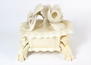 Schmuckschatulle aus Alabaster, 1.Hälfte 20.Jhd., abnehmbarer Deckel mit einer Rose verziert, ca. 19 x 16,5 x 17 cm, kl. Stelle am Fuß geklebt (hinten)