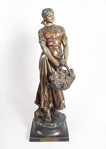 Dame einen Korb mit Trauben haltend um 1900, Regule (Metallguß, oft als BRONZE bezeichnet!), "LES VENDANGES par A. J. Scotte" - Die Traubenlese ! Rückseitig gemarkt, H = 44,5 cm, im Sockel verschraubt, schöne Patina