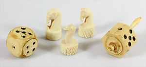 Lot: 1 Beinkreisel, H = 56 mm; 1 Beinwürfel, 21 x 21 x 21 mm; 3 Elfenbeinfiguren, H = 27 - 28 mm