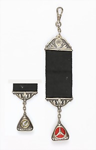 Zipfel JUGENDSTIL UM 1905, Silber 800/000, Anhänger 1 Seite mit Mercedes Sympol u. MERCEDES Inschrift, mit rotem transluzidem Emaille abgesetzt, zweite Seite mit kl. Kompass u. MERCEDES Inschrift, oben mit Uhrenkarabiener, H = 13, 0 cm, absolutes Sammlerstück !
