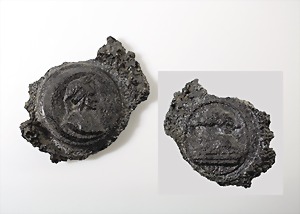 KURIOS ! Geprägtes Lavastück, Süditalien wohl "VESUV" 1.Hälfte 20.Jhd., vorne: italienische Renaissance Darstellung, RV: Asche speiender Vesuv, ca. 10,0 x 71,5 cm, total 153,6 g