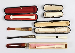 Lot Zigarrettenspitzen 1.Hälfte 20.Jhd.: 1 Stck. Silber 925/000, ART-DECO; 1 Stck. aus Bernstein u. Metall; 1 Stck. aus Holz; 5 Stck. aus Elfenbein, teilweise gedrechselt, L = 55 - 103 mm, außerdem 3 passende alte Schatullen, passend füt Zigarettenspitzen
