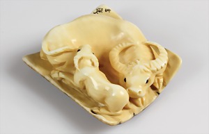 Netsuke aus Mammut-Elfenbein, neuzeitlich, liegendes "RIND mit JUNGTIER", Boden mit schöne Außenhaut (orig. Struktur), 37 x 32,8 mm