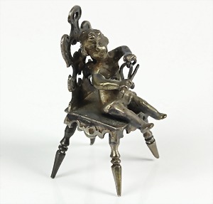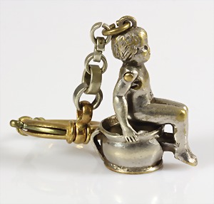Zigarrenspitze-Abschneider Anfang 20.Jhd.,"KIND AUF NACHTTOPF", Messing mit alter Versilberung, gr. Federring, H = 83,0 mm