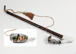 Gesteck-Pfeife, 2.Hälfte 19. Jhd. Holz mit Horn abgesetzt, Pfeifenkopf aus bemalten Porzellan, mit Deckel, L =44,5 cm