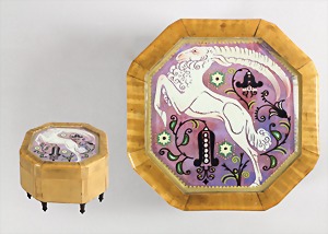 Holzschatulle auf kleinen Füßen, 1910/15, im Deckel feine ausdrucksstarke Hinterglasmalerei "STEINBOCK", mit farbigem Stoff hinterlegt, Holz geflammt, dunkel gebeizte u. gedrechselte Füße, D = 16,5 cm, H = 10,5 cm, kl. Fehlstelle im Glas