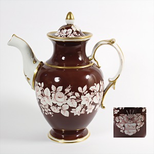 Kaffeekanne um 1880, die Kanne mit dem Wappen "von Kleist" (zwei flüchtende Füchse nach links), die Urgroßmutter war in dem Haushalt von Kleist im Dienst und bekam die Kaffeekanne zu Weihnachten geschenkt (verbrieft), Porzellan bemalt mit rotbrauner Untergrund u. floralem Dekor, goldene Akzente runden das Bild ab, sig: PAS, Kanne in sehr gutem Zustand, H = 25 cm