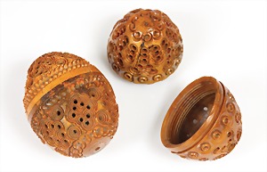 2 FLOHEIER, 19. Jhd., aus einer Nuss gedrechselt u. durchbrochen. Ein, mit einem Blutstropfen getränkter Wattebausch im Eiinnern, locken die Flöhe durch die kl. Löcher, vollgesaugt können diese später nicht mehr hinaus ! Die Floheier kamen im Mieder, unter der Perücke oder im Bett zum Einsatz, D = 42,5 u. 44,8 mm
