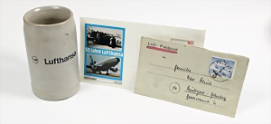 Lot: kleiner Bierkrug aus Steinzeug, "LUFTHANSA", (Boardgeschirr), D = 67,5 mm, H = 108,5 mm; Ersttagsbrief: "50 Jahre Lufthansa"; 1 Luft-Feldpost-Brief mit einer "JU" als Briefmarke, (vom ...? Mai 1944)