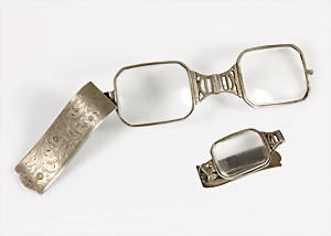 Longion als Kleiderclip, ART-DECO um 1920/30, Metall, Griff mit Blüten und Blättern verziert, eingeschliffenes achteckiges Glas, mit dem Aufklappen des Griffes, wird das auf Federspannung gehaltene Glas, entriegelt und klappt auf ! Ungewöhnliche Ausführung !