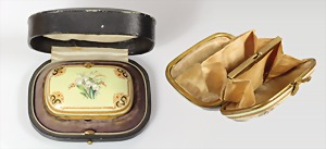 sehr aufwendig gearbeitetes Portemonaie für die feine Dame, "BIEDERMEIER" um 1820, Rahmen: Bronce mit Resten von Vergoldung, sign: REVEIL SGD.G, Glasschalen ? fein bemalt mit Maiglöckchen, als Bordüre zeitgemäßes Ornament, 3 Fächer u. 1 separates, verschließbares Fach für den Notgroschen ! Sollte der Kavalier die Kutsche nicht bezahlen, hatte die Dame noch die nötige Geldreserve ! Maße: 72,3 x 49,5 x 26,8 mm, Börse in einem sehr guten Zustand, mit Samt ausgeschlagene Originalschatulle, sammelwürdig !!