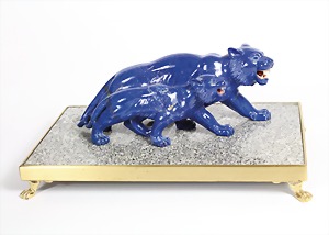 Steinskulptur 1970/80 Jahre IDAR-OBERSTEIN, "LÖWEMUTTER" mit Jungtier, geschnitten aus afghanischen Lapis (kräftige Farbe mit feiner Pyritstruktur), Zunge ist aus Koralle, die Löwenmutter steht auf einen Granitplatte, diese ist mit einem verg. Metallrahmen eingefasst. Granitplatte: 26 x 15 cm, Höhe der Skulptur ca. 14 cm. Die Skulptur stand Jahrzehnte im Heimatmuseum von Oberstein. Schleift keiner mehr für dieses Geld !!