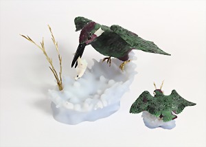 Steinskulptur 1970/80 Jahre IDAR-OBERSTEIN, "EISVOGEL" gefertigt aus Rubin-Zoisit (aus einem Stück !! ), im Onyx-Schnabel hält er einen Fisch, aus Opal gefertigt. Die Füße sind aus GG 750/00, der Sockel aus mattem u. polliertem Calcedon, ca. 15 x 11,5 cm, Höhe der Skulptur ca. 14 c: die Gräser sind aus verg. Metall. Die Skulptur stand Jahrzehnte im Heimatmuseum in Oberstein, schleift keiner mehr für dieses Geld !!