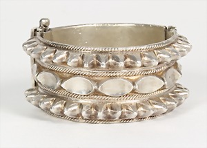 Armreif, wohl Pakistan, Silber, Armreif mit Scharnierbewegung, zackiges Relief, B = 28 mm, innen: D = 52 mm, total 180,6 g