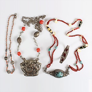 Lot: 4 Teile Schmuck aus Indien/Tibet, vorwiegend Silber, 1 Armreif mit 3 Carneolen, 1 Kette mit Korallen u. Silberteilen, L = 43,5 cm; 1 Kette vorne mit Türkis, rotes Glas u. Perlmutt, L = 70 cm (ohne Schließe), 1 Kette, Metall vers., Anhänger mit Drachenmotiv, rotes Glas, L = 79,5 cm