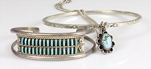 Lot: Navajo-Indianerschmuck aus den 1970/80er Jahren, 1 Armspange, Silber, 30 nebeneinander aufgereite Türkise, Innenmaß: 55 x 44 mm (unten offen); 1 Armreif, Silber, sig.: Symbol Adlerkopf 835, umlaufendes Ornament, D = 68 mm; 1 Anhänger, Silber, Türkiscab. H = 20,5 mm; Silberkette, 835/000, L = 60 cm