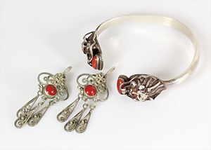 Lot: Armreif / Spange, Asien Ende 19.Jhd, Silber (geprüft), 2 gegenüberliegende Drachenköpfe mit Korallen in Mund u. in den Augen, plastisch schön ausgearbeitet und fein ornamentiert, ausgefallenes Stück ! Total 34,2 g, Ohrhänger, Silber mit roten Glascabochons, Drahtarbeit, H = 57,5 mm