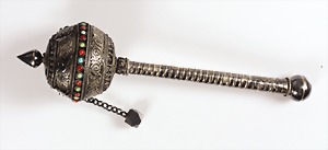Gebetsmühle, "TIBET", Silber, Kugel mit feine Drahtbelötung u. Schriftzeichen, ein Kranz mit Türkisen u. Korallen ausgefasst, L = 20,7 cm, total 123 g