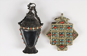 Lot: 2 Teile Schmuck aus Indien/Tibet, Silber, 1 Flacon mit Korallen u. Türkiscab., kl. Löffelchen im Deckel, H = 91 mm; 1 Amulettanhänger, vorne mit türkisfarbenem u.rotem Glas, hinten mit Deckel zum Öffnen, H = 62,5 mm, 1 kl. Koralle fehlt