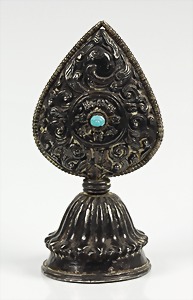 Altarobjekt, Indien, Silber, reliefartig gedrücktes Blech (dick gearbeitet), mit 2 Türkiscab., H = 96 mm, 57,4 g