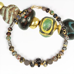 Kette mit antiken Glasperlen 200 v. Chr. - 900 n. Chr. (frühislamisch, römisch u. phönizisch), Zwischenelemente in Silber u. 750/000 Gold, L = 45,0 cm, hat nicht jeder !