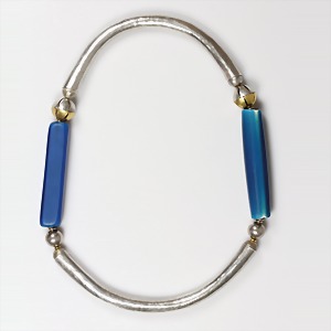 Glaskette "Goldschmiede-Unikat", blaues Glas Böhmen Mitte 20.Jhd. (gezackt u. in Scheibenform) mit 750/000 Goldelementen u. 925/000 geschwärzten Silberösen,L = 52,5 cm