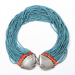 Halscollier "UNIKAT", Silber 925/000 mit Feingoldbelötung, mehrreihige Glasperlen "NAGALAND" werden von einer schön integrierten u. dekorativen Schließe zusammengefasst, L = 46,5
