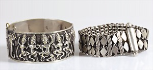 Lot: 1 Armreif Vorderasien (Indien ?), versilbert, Tempeltänzerinnen mt Elefanten, Scharnier zum Aufklappen, Breite = 29,9 mm, D = 57,0 mm; Armband (alt) wohl Indien, Silber, bewegliche Elemente, L = 19,0 cm, total 135 6 g
