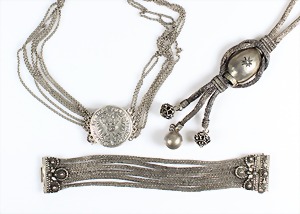 Lot: Berberschmuck wohl Nordafrika, Silber, 1 Armband L = 18 cm; 1 Collier (Kropfband) mit wohl antiker Münze: Bavaria von 1569, Kette 7-fach, L = 42 cm (incl. Verlängerungskettchen); 1 Anhänger, Strickkette L = 65 cm, alles total 85,2 g