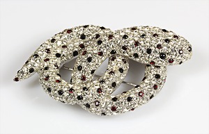 Brosche "SCHLANGE", weißes Metall, sig: CINER, weißer u. dunkelroter Steinbesatz, 60,5 x 38 mm