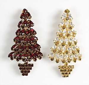 Lot: 2 Weihnachtsbaum-Broschen USA 1950/60er Jahre, goldfarben, signiert: WEISS; 1 x rote Strasssteine, ca. 77 x 40,5 mm; 1 x klare und goldfarbene Strasssteine, ca. 79 x 40 mm